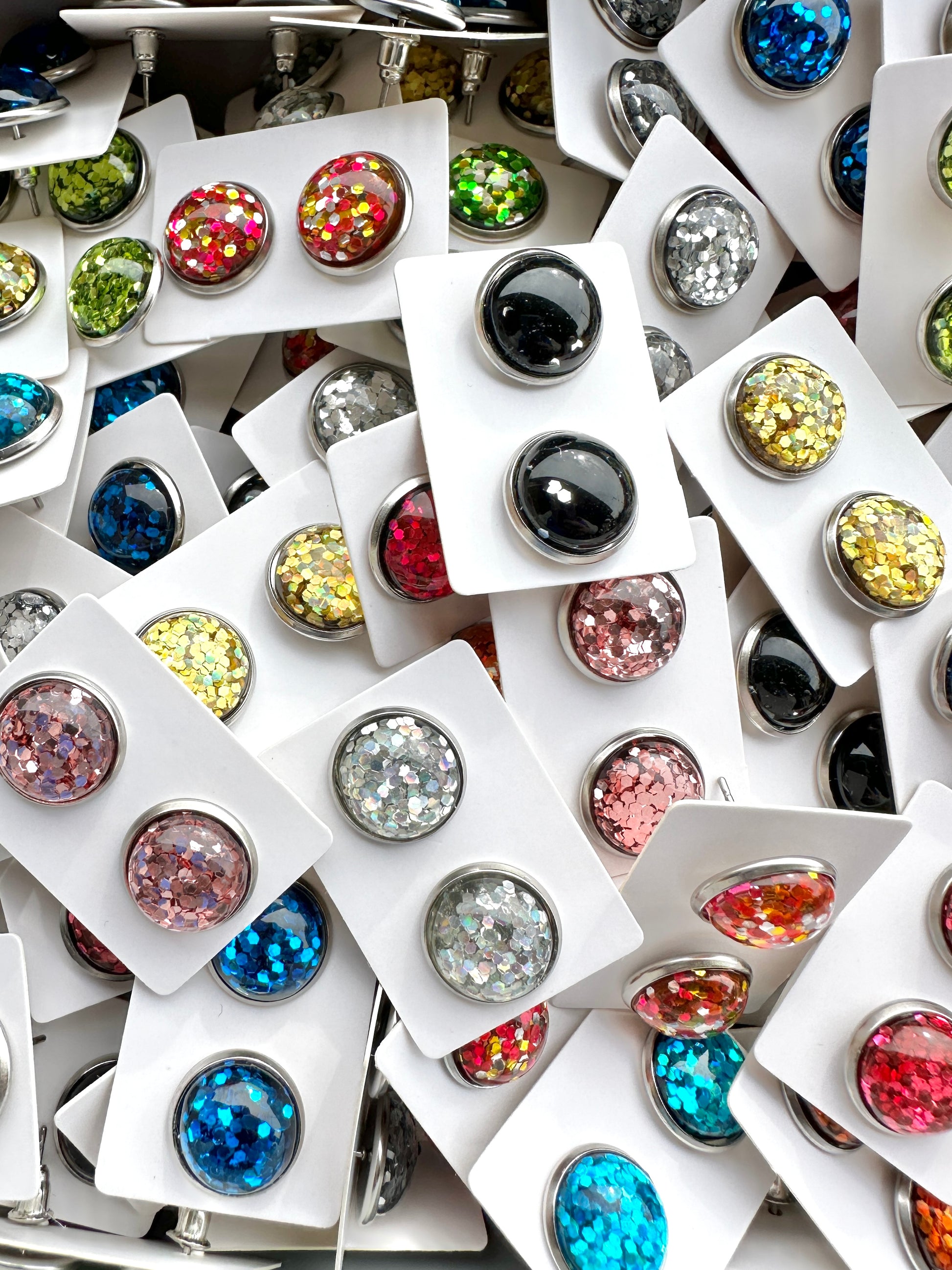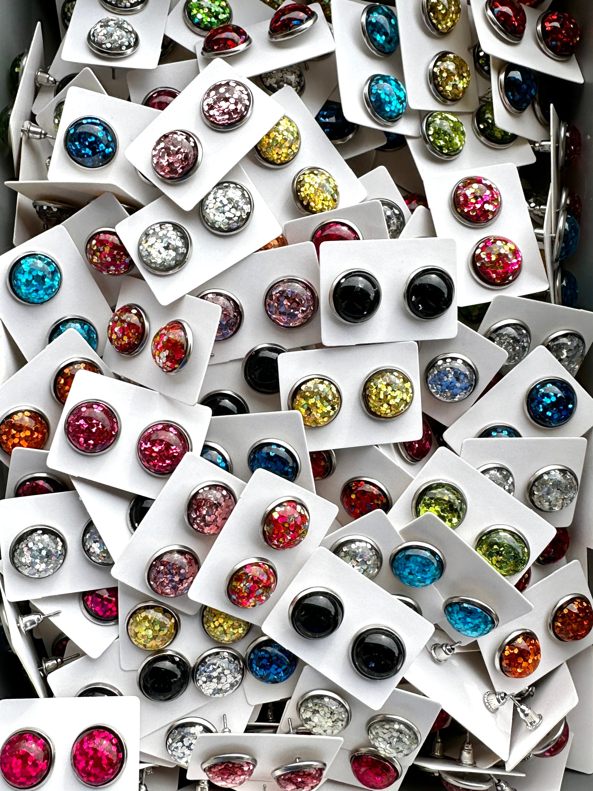 Earrings are made out of glitter resin, have stainless steel settings and measure approx. 12mm. Colors are sent RANDOMLY; duplicate colors are possible.