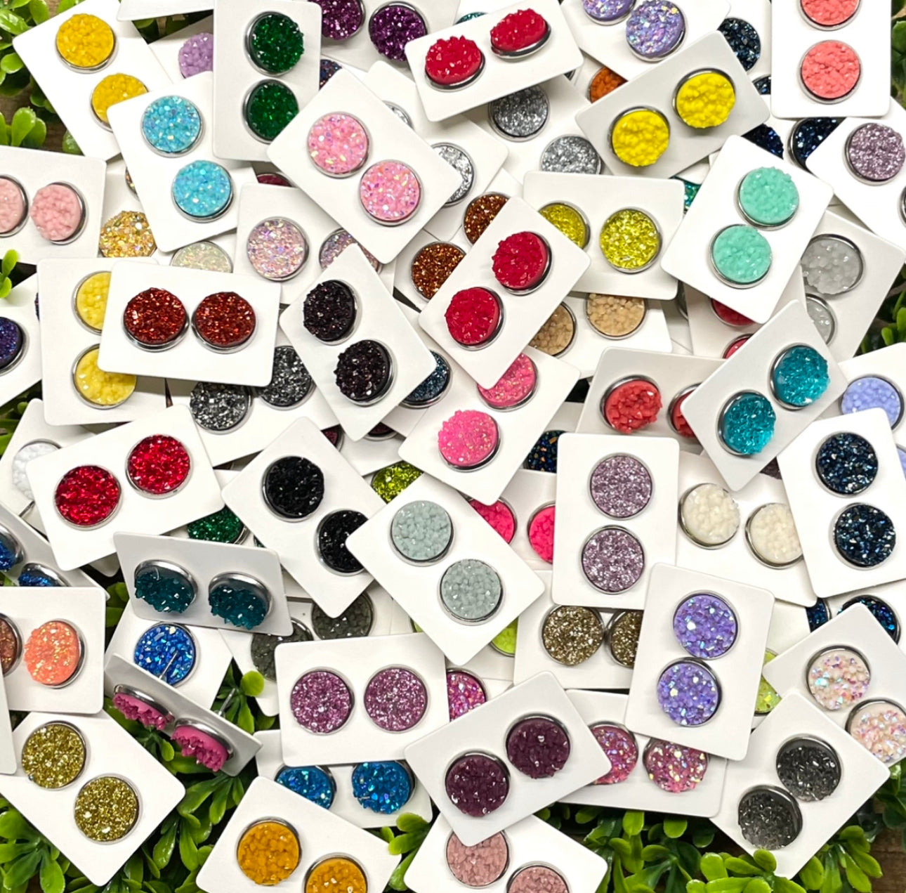 These are perfect to use in your boutique packages as 'Thank You' gifts for your customers, party favors or even as fillers for your subscription boxes. Grab bag consists of a variety if different colored faux druzy earrings.
