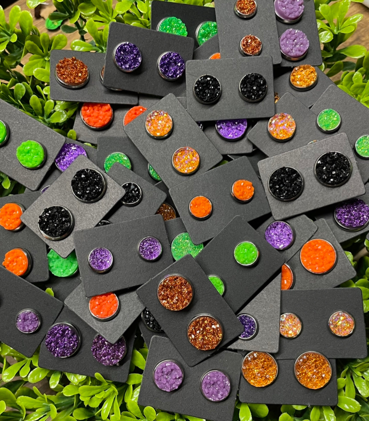These are perfect to use in your boutique packages as 'Thank You' gifts for your customers, party favors or even as fillers for your subscription boxes. Grab bag consists of Halloween colored faux druzy earrings.