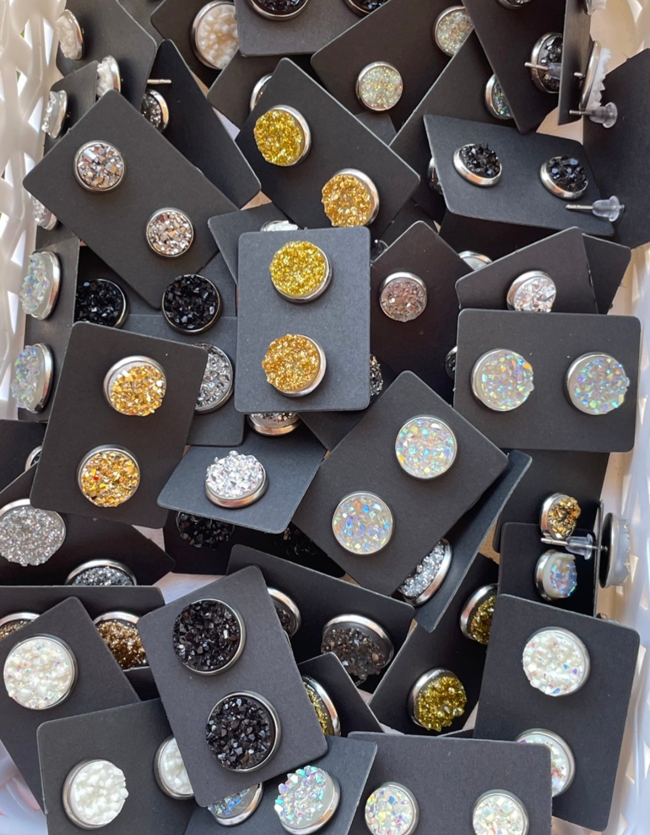 These are perfect to use in your boutique packages as 'Thank You' gifts for your customers, party favors or even as fillers for your subscription boxes. Grab bag consists of New Year's themed colored faux druzy earrings.